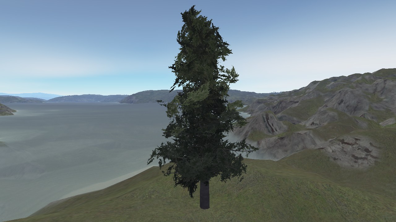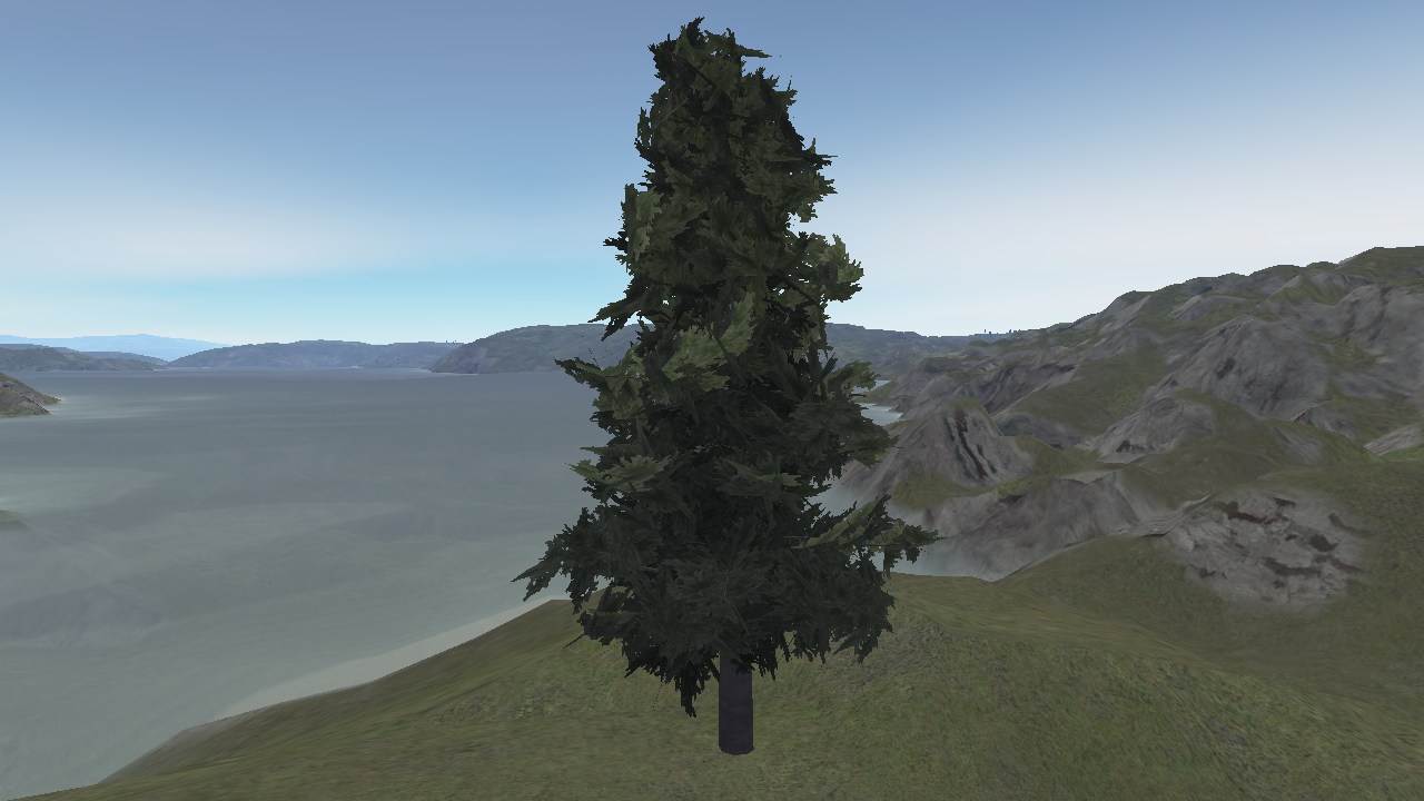Generating a unique tree mesh for each of potentially millions of tree instances is obviously prohibitively expensive in terms of computation and memory so I instead store a palette of tree type meshes one of which is used for each instance placed on a terrain tile. Each instance can have a unique orientation around the tree's primary axis along with a unique scale so there is still scope for plenty of variation on the terrain even with only a limited selection of meshes to choose from.